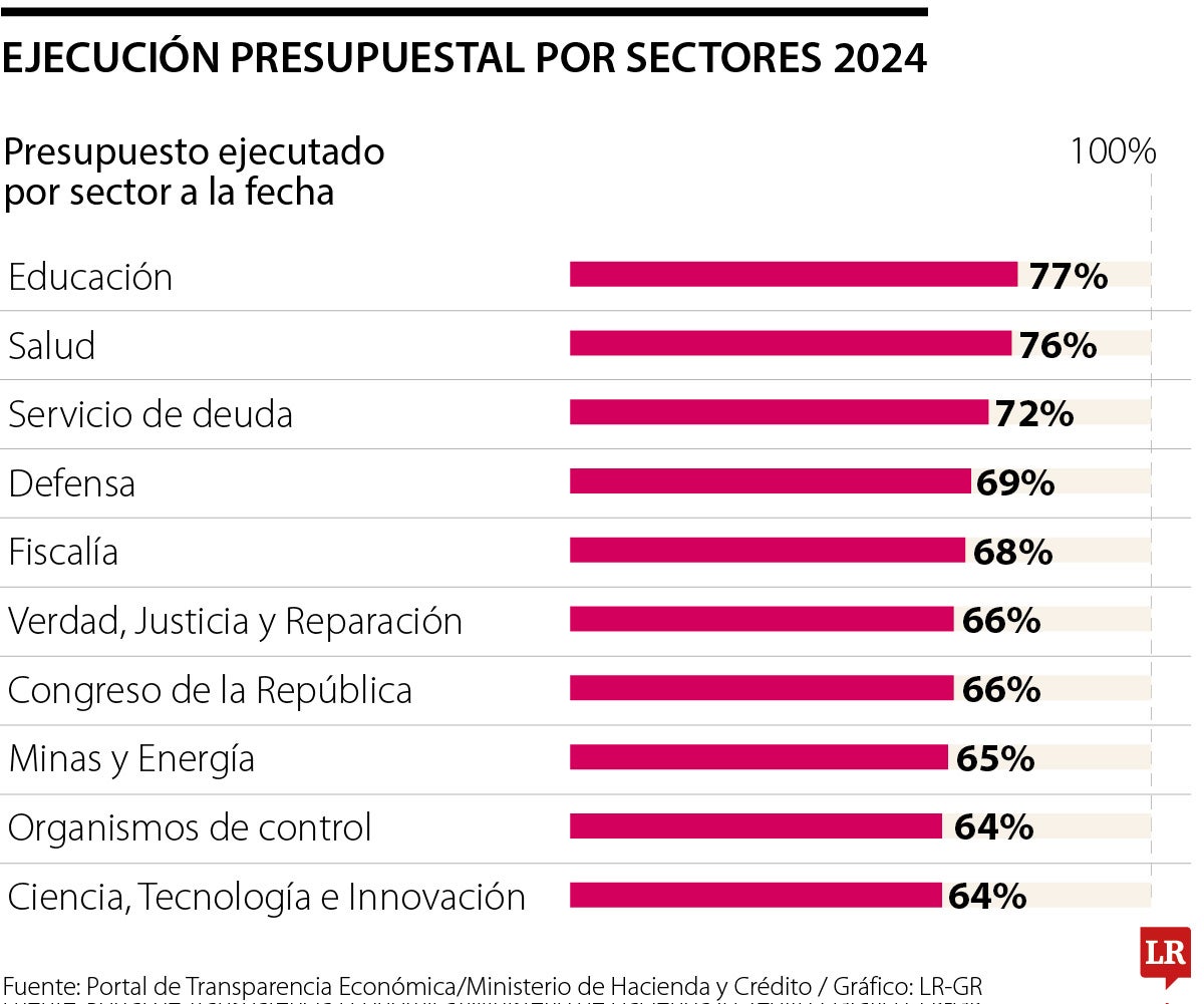 Si se detallan los presupuestos ejecutados hasta la fecha, el sector educación se lleva 77% en lo que va de 2024, Salud y Protección social va 76%, siendo estos dos los que registran cifras más altas en gasto.