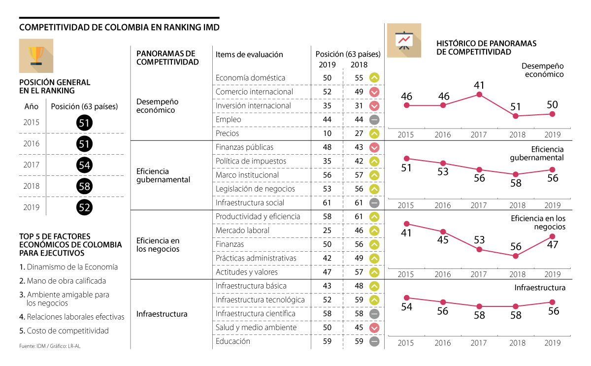 Para entender el aumento de Colombia en el listado hay que analizar los datos en las cuatro categorías que estudia el IMD: desempeño económico, eficiencia gubernamental, eficiencia en los negocios e infraestructura. De este grupo, la tercera categoría fue la de mayor repunte, ya que subió nueve posiciones, pasando del puesto 56 al 47. Esto significa que todas sus variables, como productividad y eficiencia, mercado laboral, finanzas, prácticas administrativas, actitudes y valores, también crecieron.