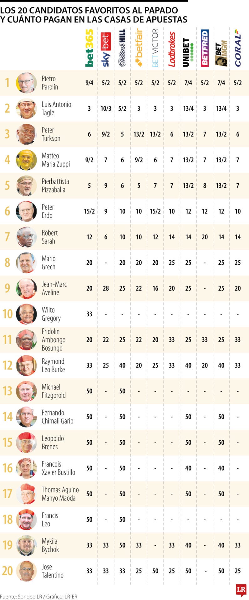 Pietro Parolin y Luis Antonio Tagle siguen liderando las apuestas. Por ejemplo, la famosa casa de apuesta Bet365 está pagando 9/4 o una cuota de 2,25. Sky Bet, William Hill, Betfair, Betvictor, ladbrokes y Betfred paga 5/2 o 2,5, lo que significa que si apuesta $1 millón en alguna de estas últimas casas a Parolin o Tagle y gana, recibirá $2,5 millones.