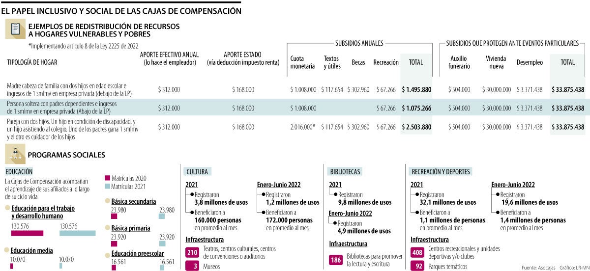 Con más de 21 millones de beneficiarios en 895 municipios de Colombia, las cajas de compensación tienen un gran potencial de aportar a la inclusión social, cultural y económica. Para 2022, según información de Asocajas, estas proyectan entregar $1 billón a la población vulnerable a través del régimen subsidiado de salud, las jornadas escolares complementarias y en el marco del programa de atención a la primera infancia.