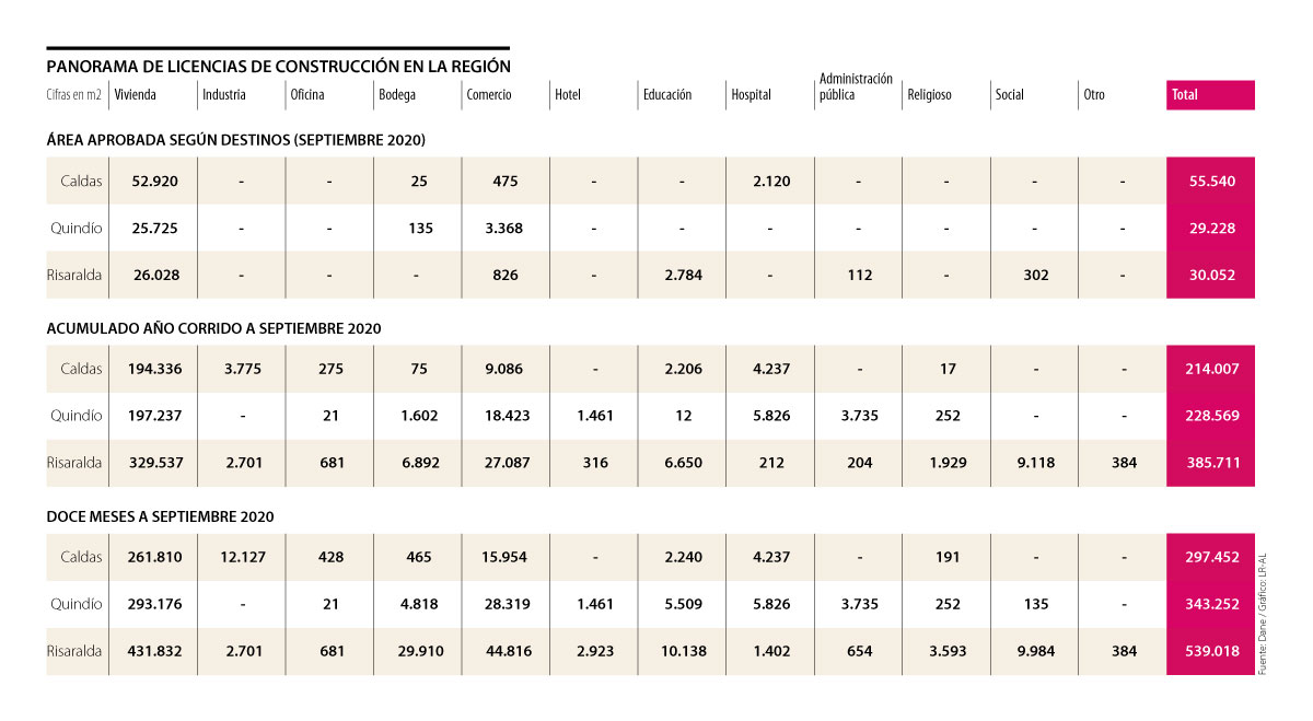 En el desagregado, el reporte del Dane indica que, en septiembre de 2020, en Caldas se aprobó un área para vivienda por 52.920 m2, 25 para bodega, 475 para comercio y 2.120 para hospitales. Mientras que en Risaralda se aprobaron 26.028 para vivienda, 826 para comercio, 2.784 para educación, 112 para administración pública y 302 metros cuadrados para destino social.