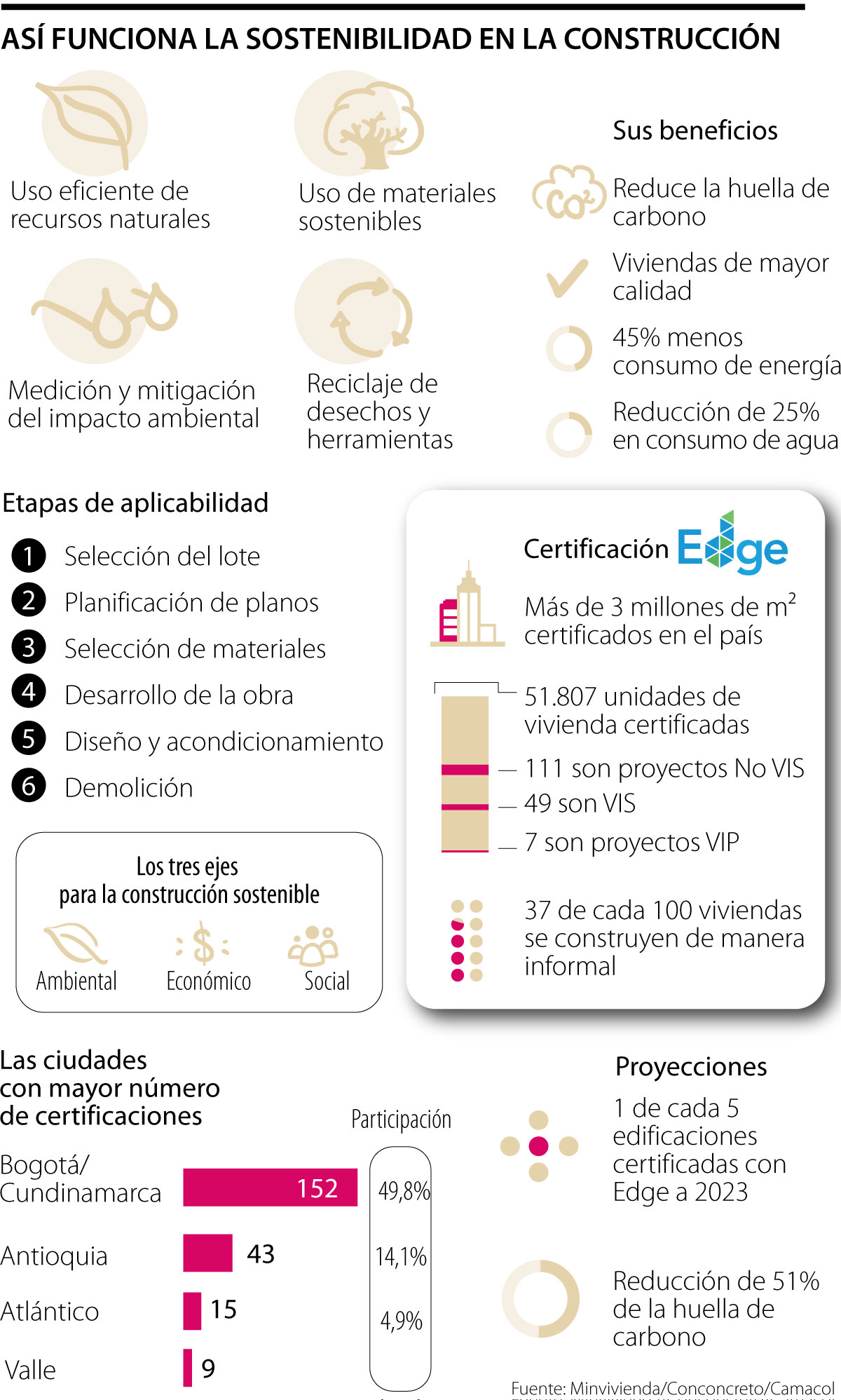 Con más de tres millones de metros cuadrados certificados en Edge, Colombia es uno de los líderes mundiales en construcción sostenible. Estos están representados en 201 proyectos, de los cuales 138 son residenciales y equivalen a 51.807 unidades de vivienda.