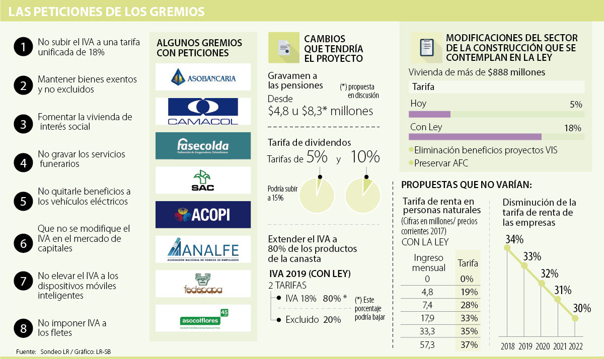 Entre los gremios más preocupados por los cambios que contempla la iniciativa del Gobierno de Iván Duque destacan algunos como Camacol o Asobancaria, los cuales hicieron énfasis en el impacto que sufriría el sector de la construcción de eliminarse las exenciones de los proyectos de interés social (VIS). “Realizamos 100.000 viviendas sociales al año. No se puede poner en riesgo la viabilidad de la construcción y la financiación de la vivienda social”, sentenció ante los diferentes congresistas la presidenta de Camacol, Sandra Forero.