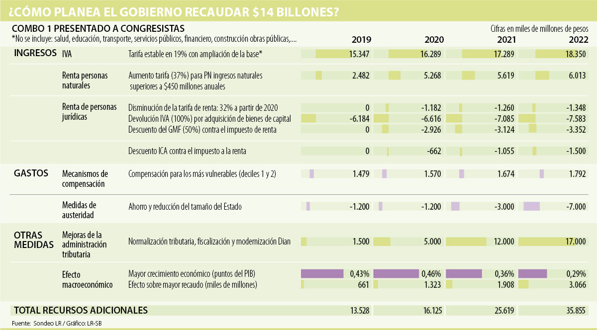En concreto, fueron tres los posibles combos que se les presentaron hace varias semanas a diferentes congresistas (ver combo 1 en el gráfico). En materia de IVA se estableció un escenario con una tarifa estable en 19% que recaudaría hasta $15,3 billones en 2019; otro con una reducción gradual de 19% a 16% que permitiría $11,9 billones adicionales para el próximo año y un tercero con un impuesto de 17% que lograría $8,5 billones. De esos ingresos, se sacarían alrededor de $1,4 billones en los tres casos como mecanismo de compensación monetaria para los más vulnerables.
