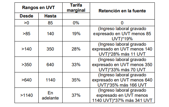 La retención en la fuente "aplicable a los pagos gravables efectuados por las personas naturales o jurídicas, las sociedades de hecho, las comunidades organizadas y las sucesiones ilíquidas", se pueden observar en esta tabla: