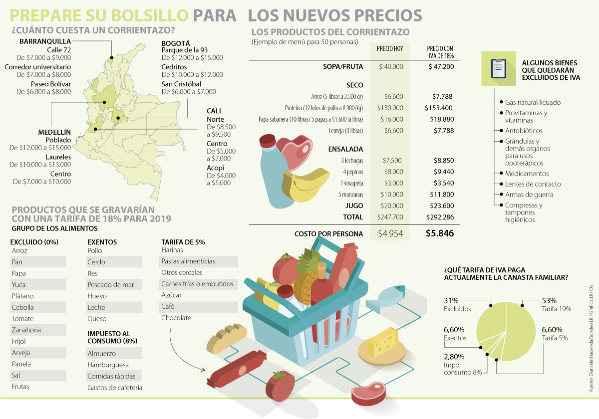 Sin embargo, si tenemos en cuenta que todos los productos que suele incluir un ‘corrientazo’ tradicional como podría ser el caso de una sopa del día; un principio como la lenteja; una proteína como el pollo o la carne de res; una harina como el maduro o la papa; el arroz, una ensalada con lechuga, tomate o zanahoria; o el jugo empezarían a gravarse, los dueños de este tipo de restaurantes podrían establecer un precio superior ya que se les incrementarían considerablemente los costos y se les reduciría su rentabilidad.