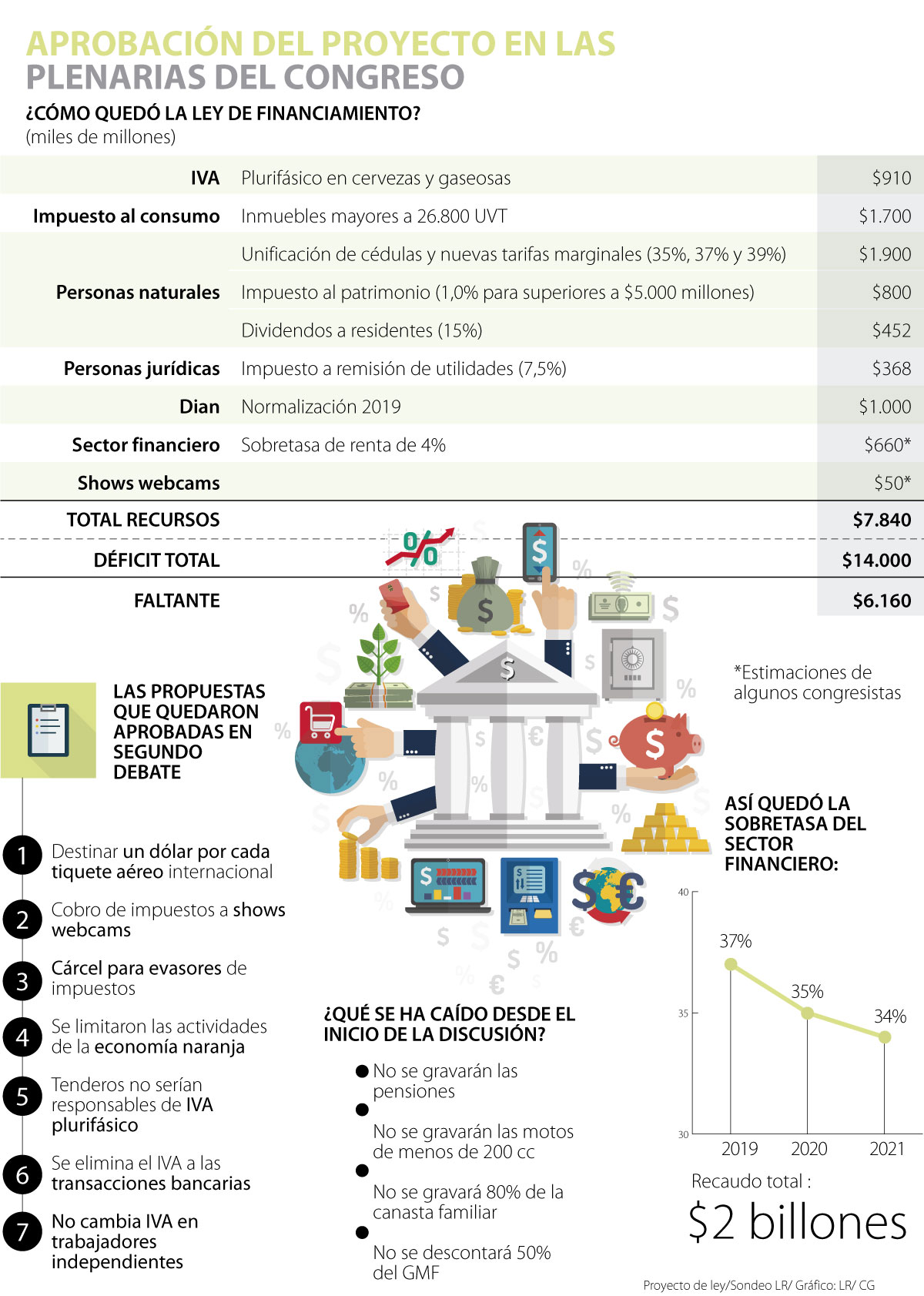 Finalmente, la sorpresa final del proyecto de ley de financiamiento fue la incorporación de una sobretasa de renta de 4% a las entidades financieras del país, entre las que se encontrarían algunas como los bancos, las aseguradoras o las compañías de leasing, entre otras. Con esta propuesta transitoria del senador del Partido Conservador David Barguil se esperan recaudar hasta $2 billones en los tres años que duraría (37 de renta % en 2019; 35% en 2020; y 34% en 2021).