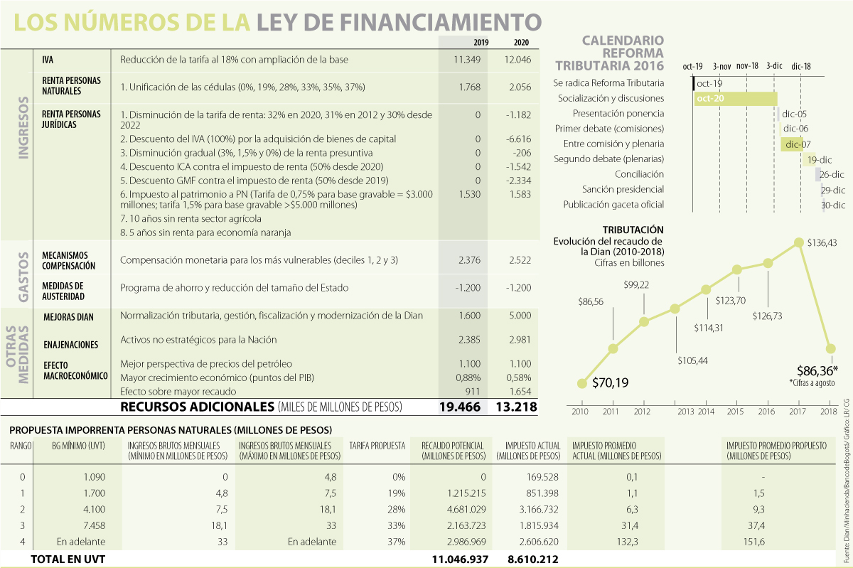 Finalmente, el Gobierno presentará un proyecto que planea recaudar $19 billones para 2019, lo que representa 1,8% del PIB. El grueso de los recursos vendrán de la ampliación de la tarifa de IVA a la mayoría de productos de la canasta familiar, de un gravamen más alto a las personas naturales de mayores ingresos, de una reducción del tamaño del Estado, de un plan de enajenaciones de la Nación, de los mayores ingresos petroleros y de la modernización de la administración tributaria.