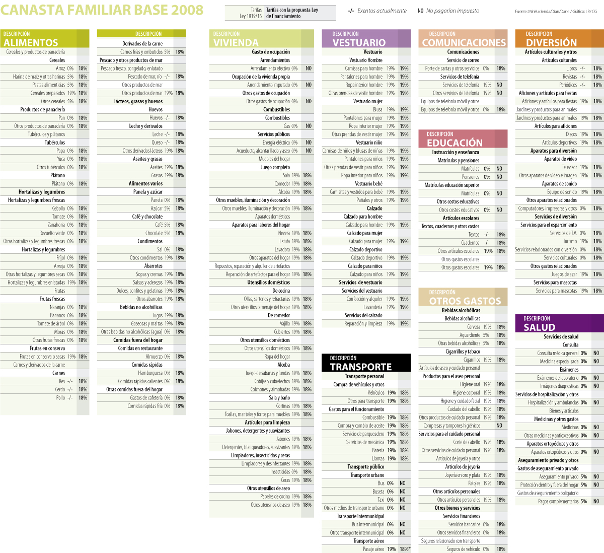Con la última reforma tributaria se creó una tercera tarifa para el IVA, la cual grava a 35% de los productos de la canasta familiar con una tasa de 5%. A la mayoría de estos, que son bienes que requieren procesamiento como azúcar y carnes frías se les aumentaría la tasa a 18%, pero hay algunos servicios como los relacionados con seguros de salud que pasarían a tener una tasa de 0%.