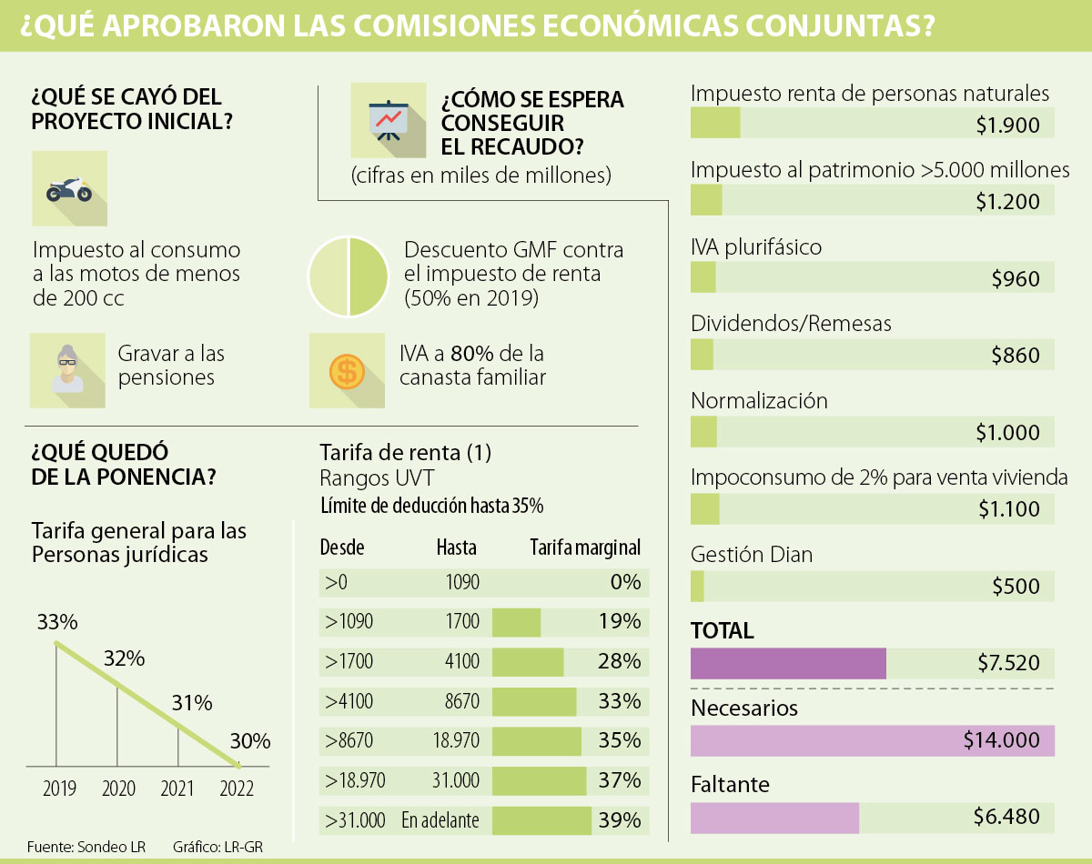 Por su parte, aunque el artículo que hace responsables de IVA a las personas naturales que presten servicios con ingresos iguales o superiores a $6,8 millones pasó en primer debate en las Comisiones Económicas Conjuntas del Congreso, se le subió el monto por el que empezarán a tener ese gravamen a $8,2 millones.