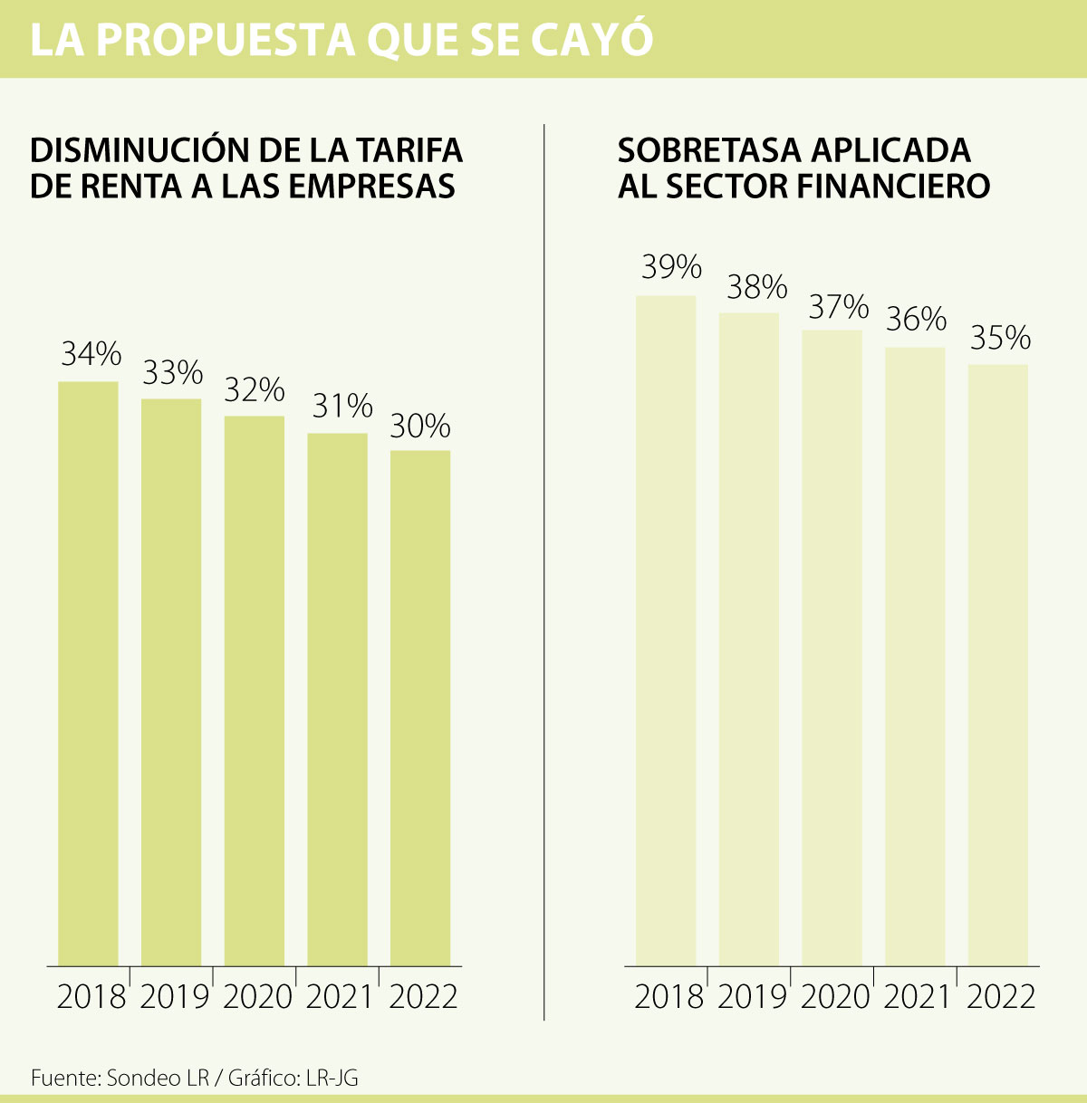 Una de las razones de inconveniencias que señala el documento conocido por LR es que la sobretasa de 5% adicional al sector financiero sería contraria a las recomendaciones de la Organización para la Cooperación y el Desarrollo Económico (Ocde) relacionadas con la disminución de los gravámenes a rentas corporativas, pues mientras que la tendencia de sus países miembros maneja un promedio global del 23,9%, “el proyecto propone para 2019, tener una tarifa de 33%, y además, con la sobretasa propuesta, quedaría en 38% para el sector”.