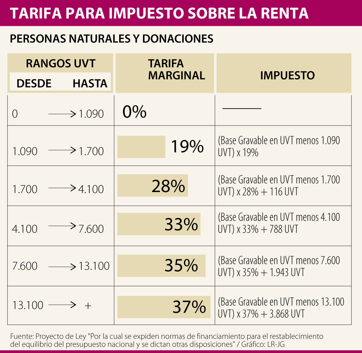De este modo, se establece que las personas que ganen ingresos desde 0 a 1.090 UVT no pagarían renta; las que obtengan entre 1.090 y 1.700 UVT tendrían una tarifa de 19%; a las que se embolsen al mes entre 1.700 y 4.100 UVT se les aplicaría una tasa de 28%; para las que ingresen entre 4.100 y 7.600 UVT ascendería a 33%; para las que ganen entre 7.600 y 13.100 UVT la tarifa sería de 35% y para las más de 13.100 UVT en adelante quedaría en 37%.