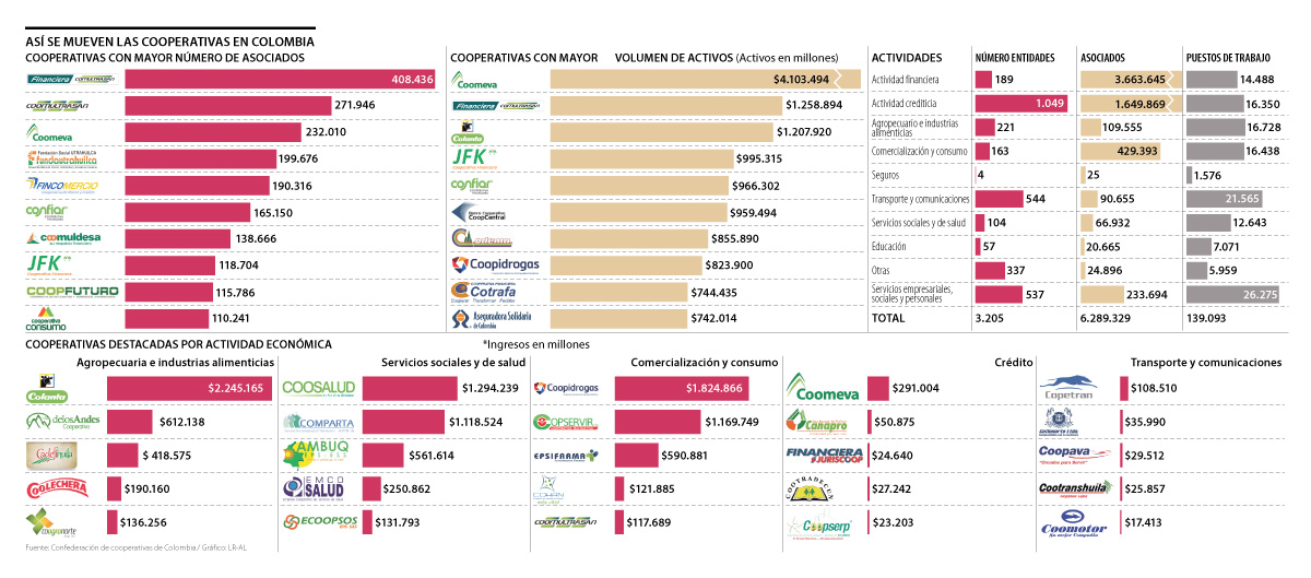 De acuerdo con datos de la Confederación de Cooperativas de Colombia (Confecoop), en Colombia hay 3.205 cooperativas que generan 139.000 puestos de trabajo, asocian a más de seis millones de personas y esperan ingresos por $30 billones, al cierre de este año. Este modelo tiene presencia en 25 sectores de la economía entre los que están salud, vivienda, educación, recreación, turismo, ahorro, crédito, transporte, cultura y servicios públicos.