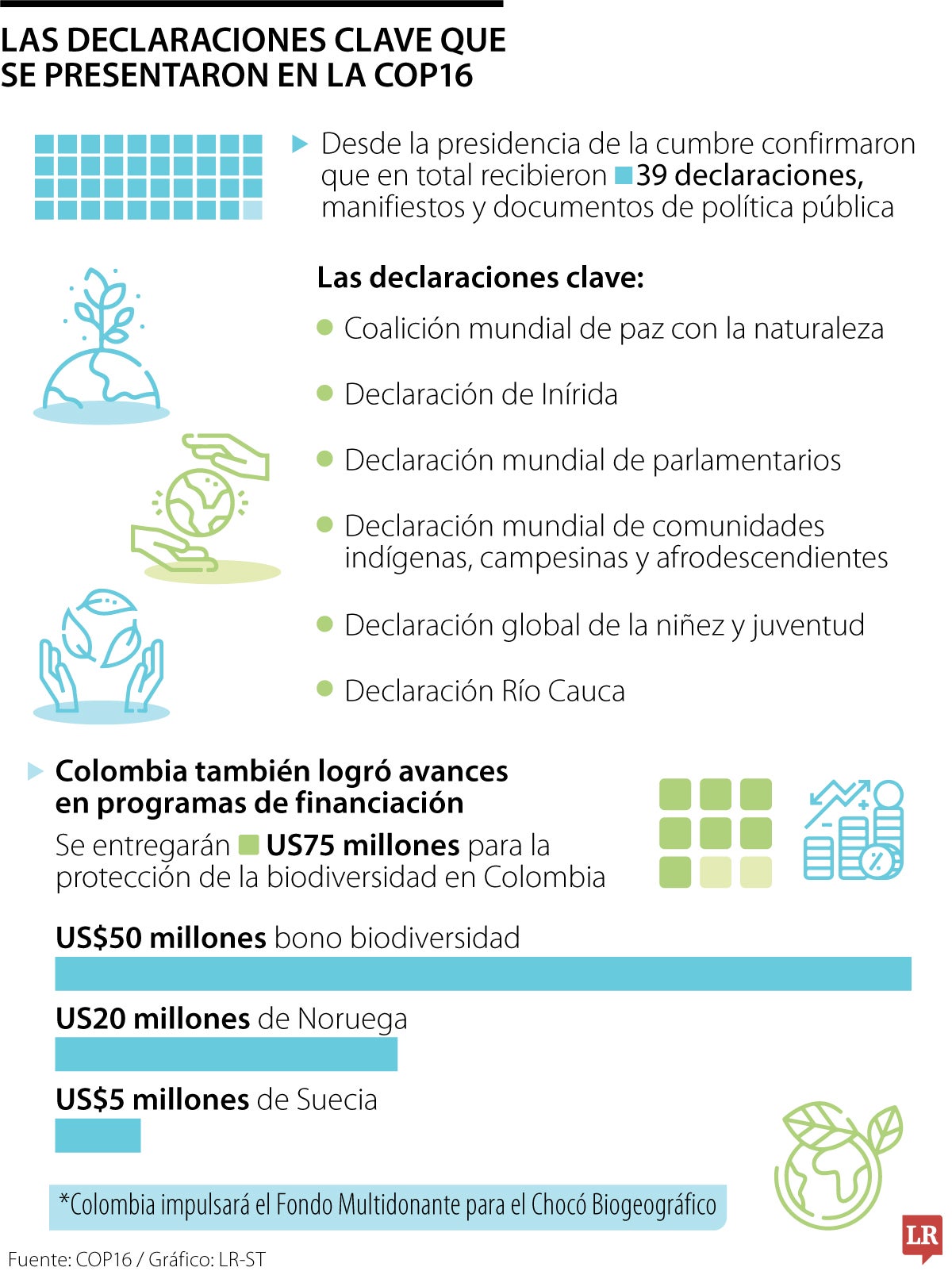 De las 39 declaraciones, seis están enfocadas en la conservación del agua, estar en “paz” con la naturaleza y en la economía circular. Otras de las iniciativas claves son que los campesinos, indígenas y afrodescendientes sean los guardianes de la biodiversidad tras la COP y que la conservación de la biodiversidad sea clave en las agendas legislativas internacionales.