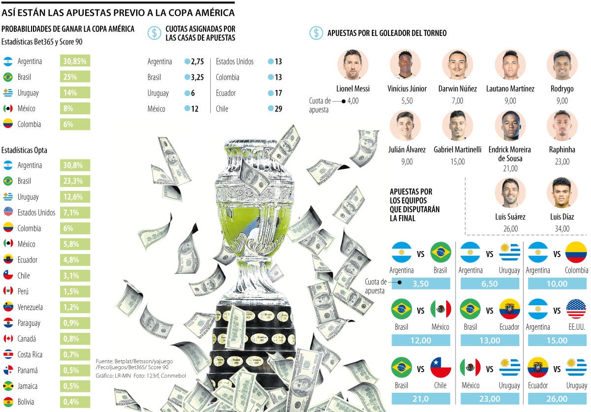 Aunque el torneo está a horas para iniciar y se acaba hasta el 14 de julio, las casas de apuestas ya tienen sus pronósticos sobre quién podría ser el campeón; Argentina es el favorito