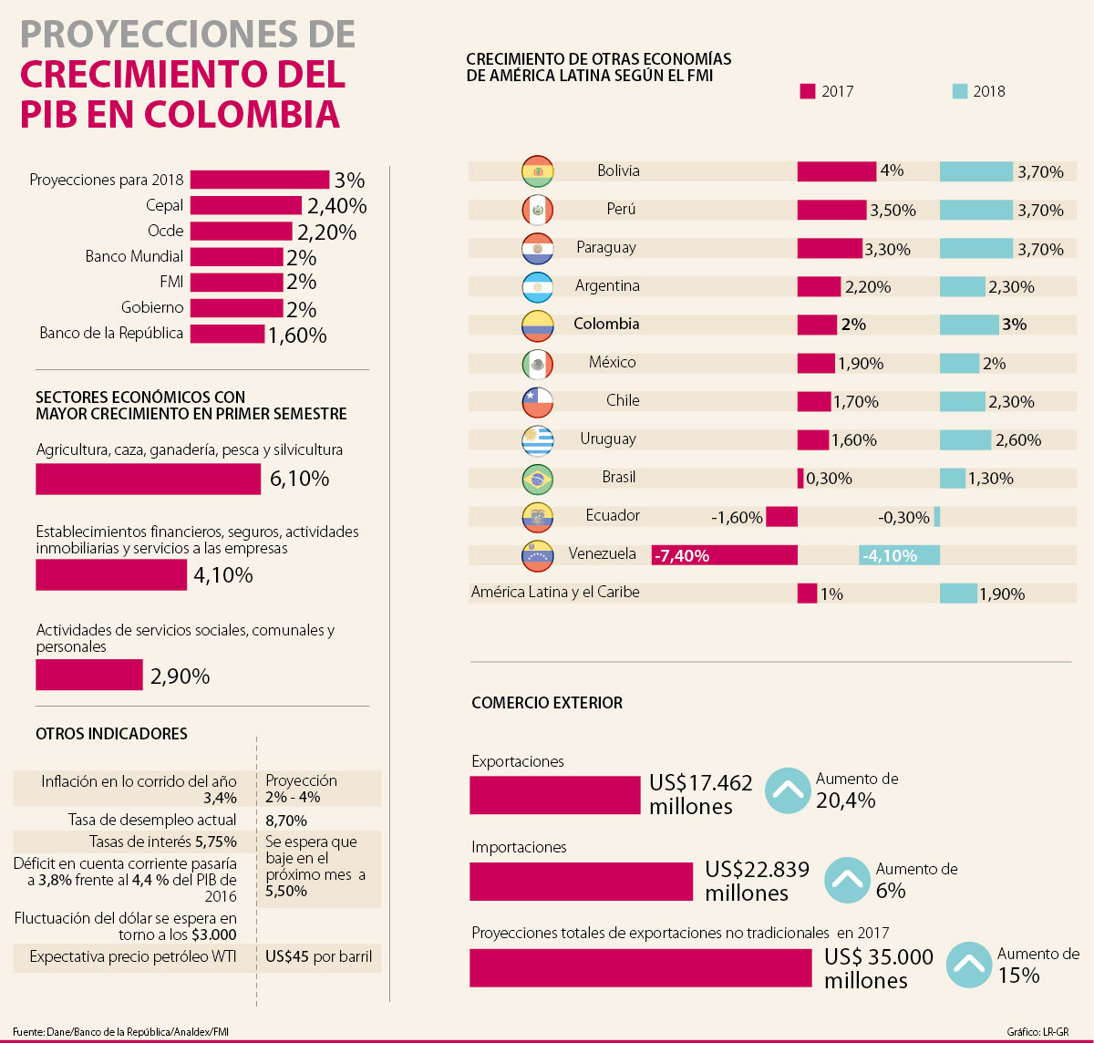 Con un crecimiento total de 1,2% en el primer semestre del año en el que destacaron sectores como agricultura con 6,1% y servicios financieros con 4,1%, el panorama económico de Colombia afronta un semestre decisivo de cara a la recuperación en el que el Gobierno espera como balance final un aumento en el PIB cercano al 2%, mientras que para 2018 las proyecciones se ubican en 3%.