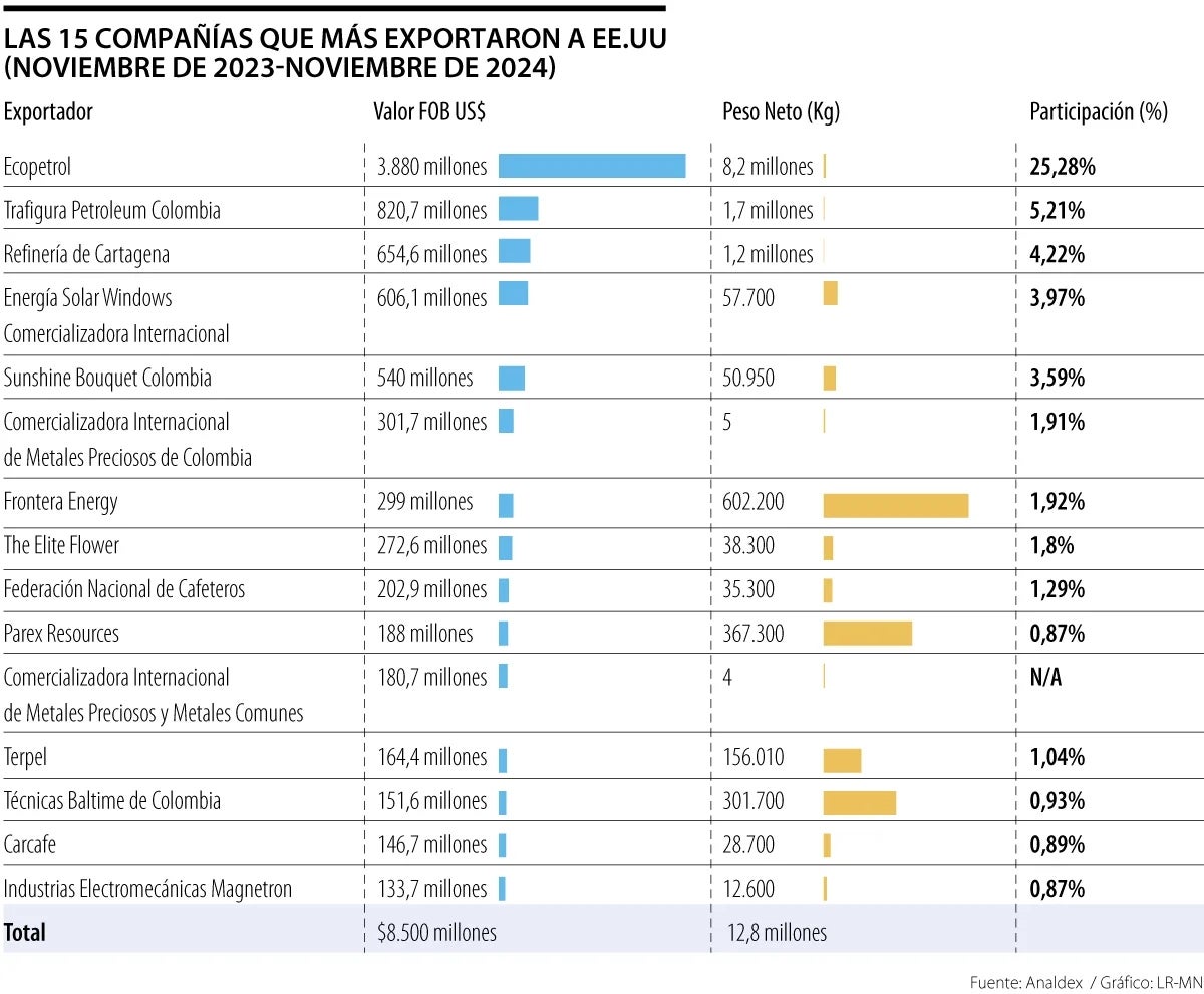 Tanto Araujo Ibarra como la Asociación Nacional de Comercio Exterior, Analdex, revelaron que las empresas que más exportan a EE.UU son Ecopetrol, Trafigura Petroleum Colombia, la Refinería de Cartagena, la comercializadora internacional Energía Solar y Sunshine Bouquet.