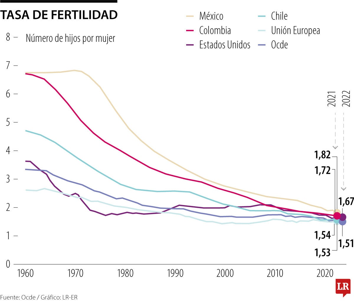 Si bien Colombia es de los promedios más altos, pero en Francia, se estima una tasa de nacimientos de 1,8 hijos en promedio entre las mujeres de ese país. Luego está México con 1,82 hijos por mujer y en primer lugar como el más fértil de la Ocde está Israel con una tasa de 2,8, siendo el único territorio de la organización que está por encima de la tasa de reemplazo.