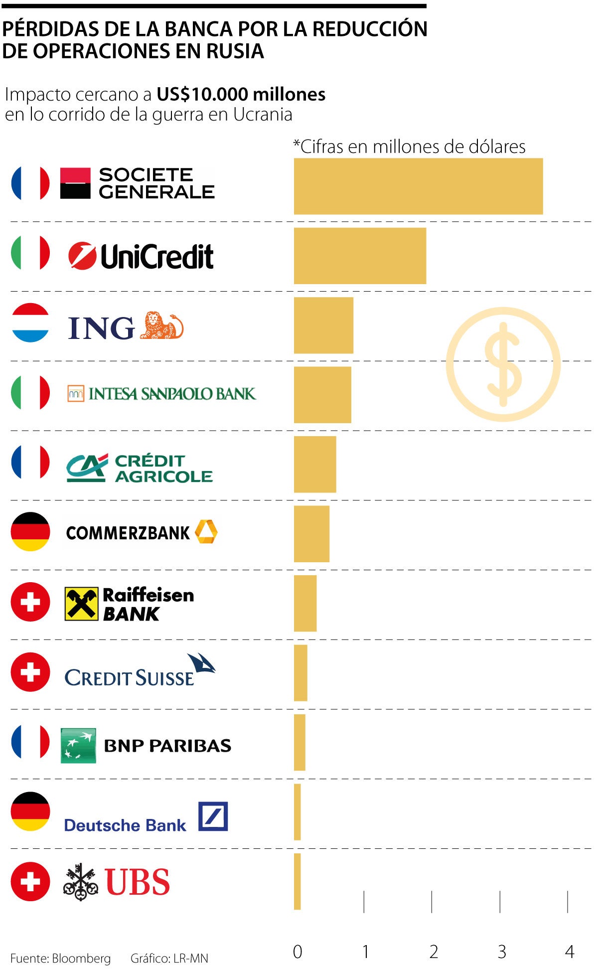 Dirigidos por Société Générale y UniCredit, los prestamistas de la región han señalado hasta ahora un impacto de alrededor de US$10.000 millones, principalmente por reducir el valor de sus operaciones en la región y reservar dinero como escudo contra las ramificaciones económicas esperadas.