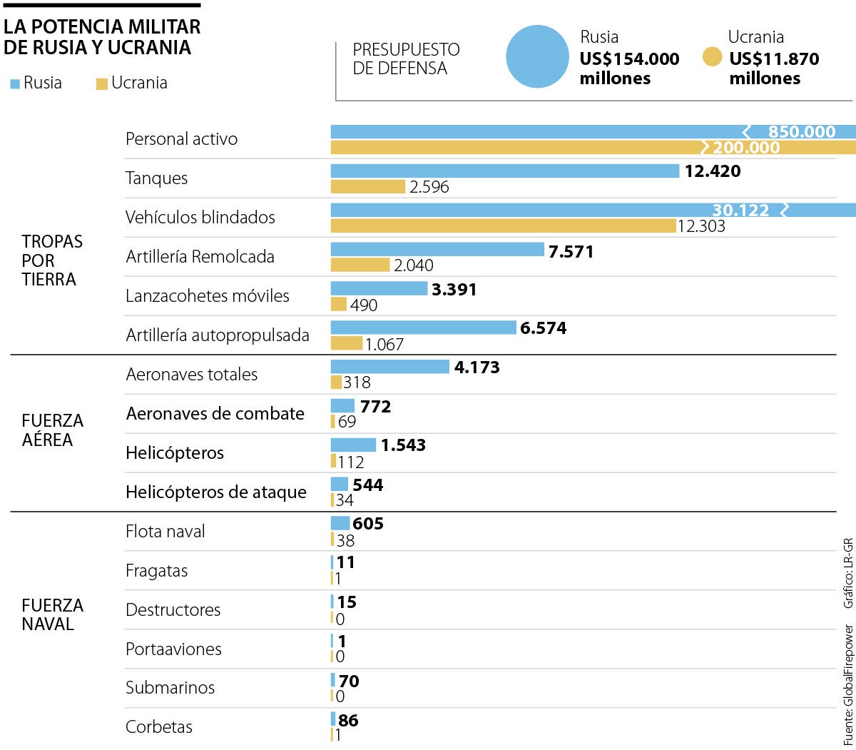 Ante ese panorama hay que analizar cuál es el poder de las tropas de Moscú. De acuerdo con el ranking de 2022 de Global Firepower, Ucrania apenas tiene 200.000 soldados disponibles activos, en comparación con los 850.000 efectivos rusos que se reportan en ese estudio. Por eso Kiev buscó más personal en las reservas, e incluso el alcalde de Kiev, un exboxeador, dejó su oficina para sumarse a la defensa.
