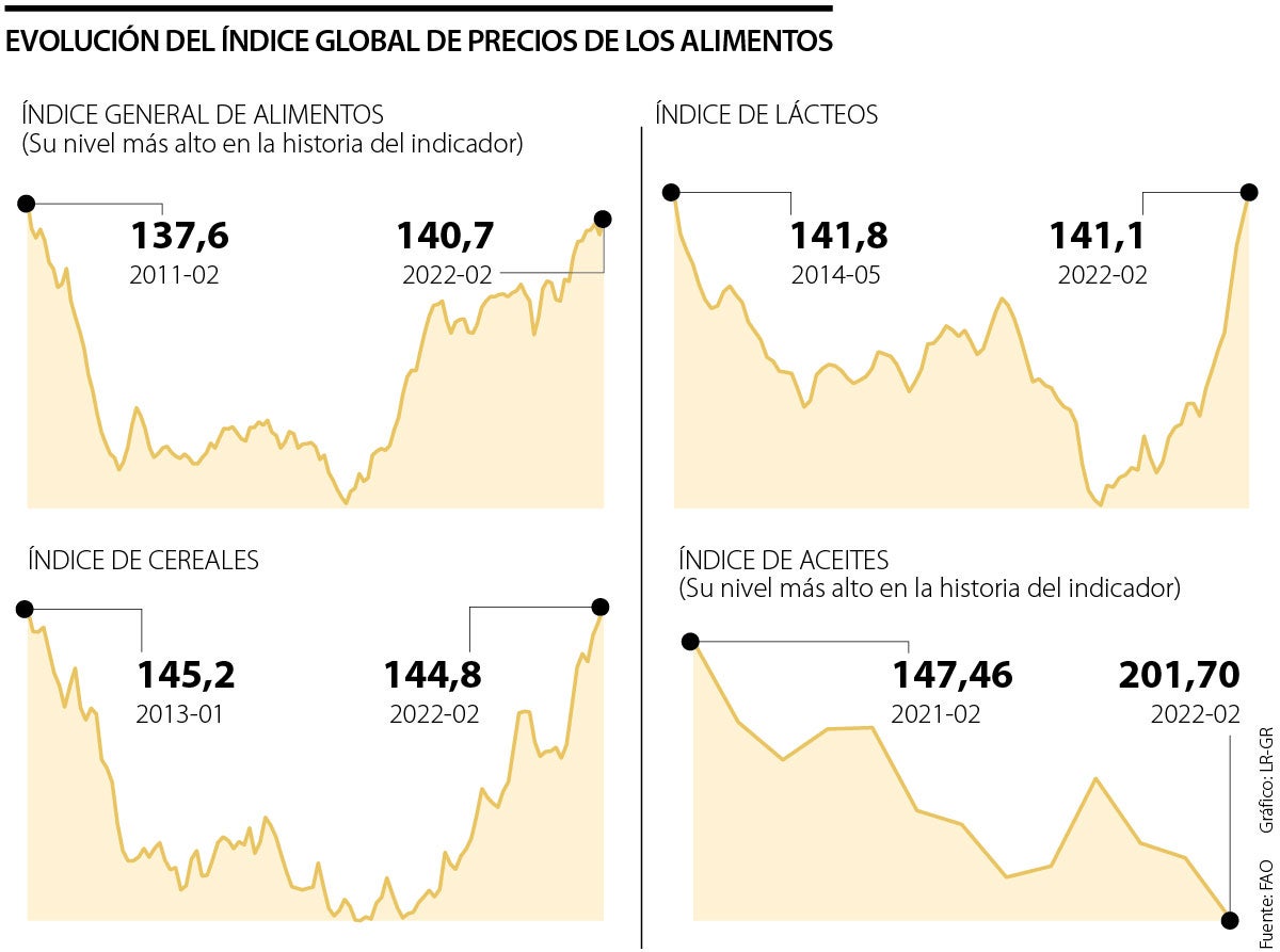 Otros eventos mundiales sumados a la crisis en Ucrania, también generaron movimientos de encarecimiento de los alimentos, por ejemplo, el índice de precios de los aceites vegetales subió 8,5% desde el mes anterior y alcanzando un nuevo récord. El impulso se vio principalmente por el aumento de las cotizaciones de los aceites de palma, de soja y de girasol. En cuanto al índice de lácteos, que en febrero se disparó 6,4%, fue por “unos suministros de leche menores de lo previsto en Europa occidental y Oceanía, así como una demanda de importaciones persistente, especialmente de Asia septentrional y Oriente Medio”, destaca la FAO.