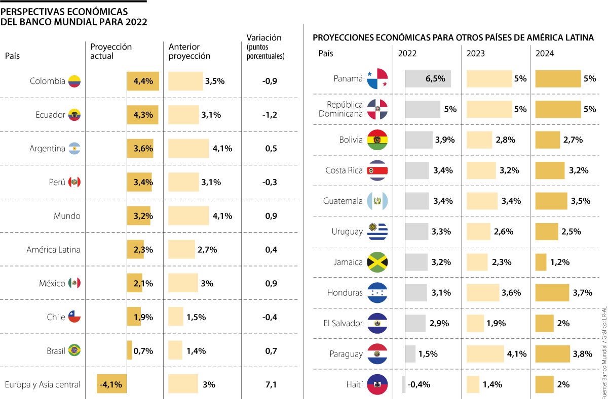 En un informe recientemente entregado por el Banco Mundial exclusivamente sobre América Latina, el organismo elevó su pronóstico de crecimiento de Colombia a 4,4% desde 4,1%, el más alto de Suramérica y uno de los más elevados de Centroamérica y las islas del Caribe. El banco destaca su potencial para la transformación energética y la posibilidad de generar grandes cantidades de energía eólica en La Guajira. Además es una de las 12 economías de la región cuyo crecimiento económico acumulado desde la aparición del covid-19 ya superó los niveles previos a la pandemia.