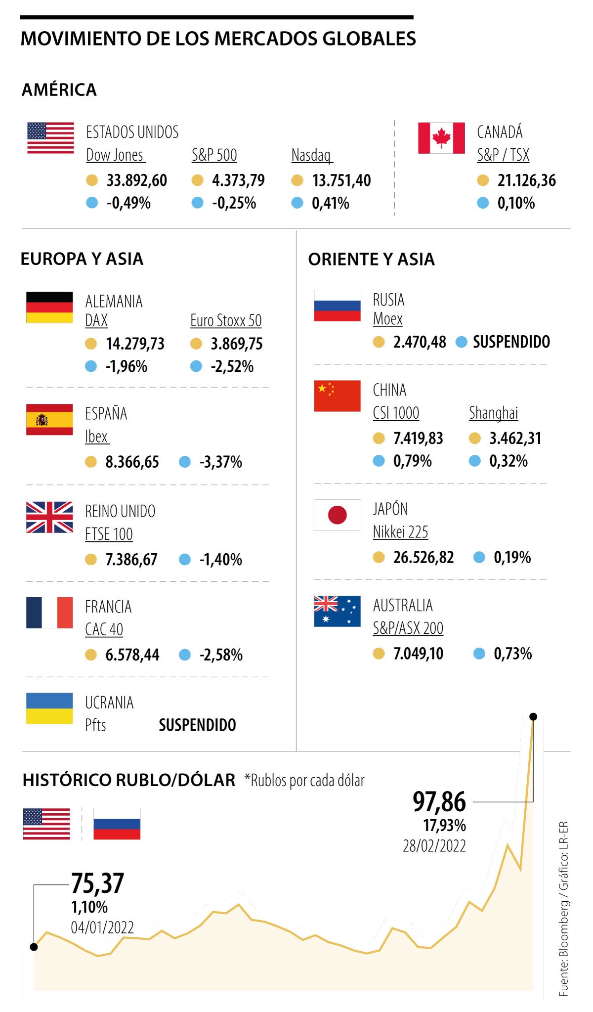 Al mismo tiempo el efecto de las sanciones que restringe el comercio y negociación internacional con o desde empresas rusas, generó que las bolsas de Europa cerraran en rojo, pues muchas compañías cotizan en Reino Unido, Alemania, España o Francia.