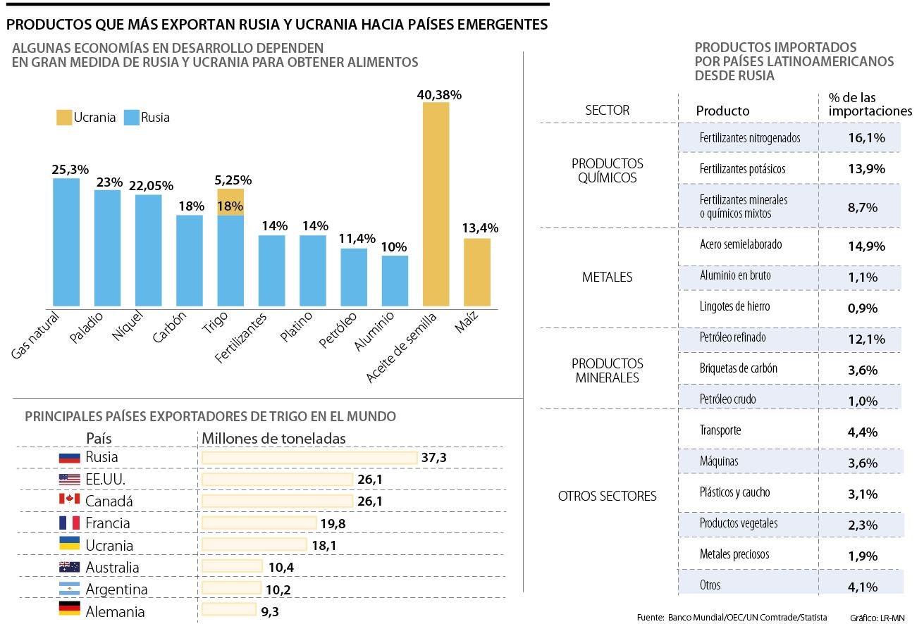 Según el Observatorio de la Complejidad Económica (OEC por sus siglas en inglés), los fertilizantes son el principal producto importado desde Rusia en América Latina. Los fertilizantes nitrogenados, potásicos y mixtos representaron casi 40% de todas las importaciones latinoamericanas provenientes de Rusia, por lo que la inflación en los alimentos de la región también se vería golpeada.