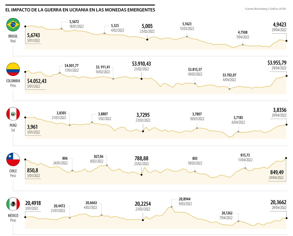 La mayor ganancia de la moneda frente al dólar se vio en Brasil con el real, que comenzó 2022 en 5,67 reales por cada dólar y el 23 de febrero la moneda estadounidense estaba en 5,00 reales. Luego, tocó un mínimo de 4,59 reales por cada dólar, el pasado cuatro de abril, 8,24% menos que cuando inició la guerra y más de 19% desde que comenzó el año.