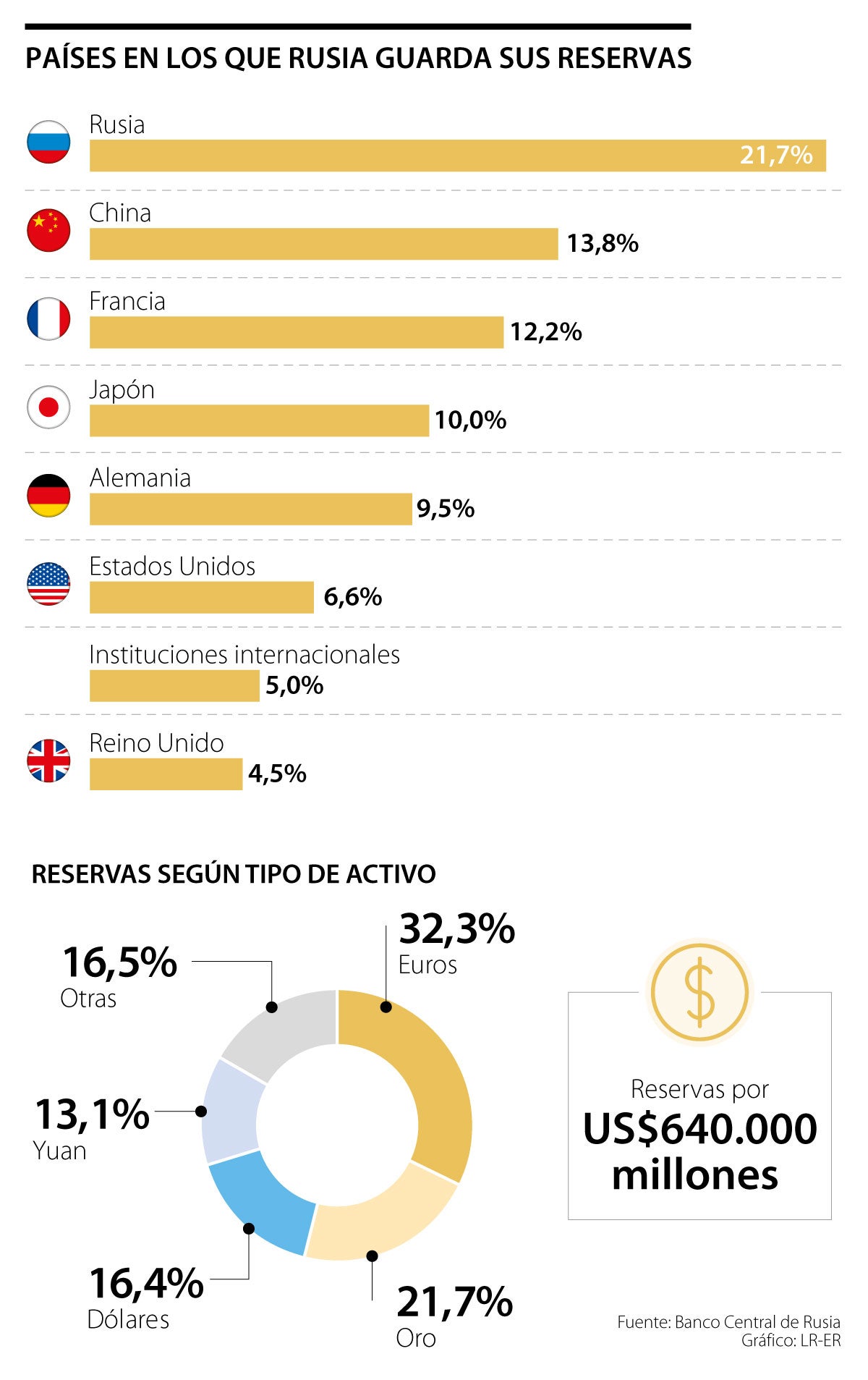 Casi 50% de las reservas del Banco de Rusia están en cuentas de Occidente o alguna institución internacional que también le sigue el paso a la línea de sanciones contra Moscú, según el premio Emisor. Entre Francia, Alemania, Estados Unidos, y Reino Unido, además de sumar agencias extranjeras, está el fuerte de los activos.