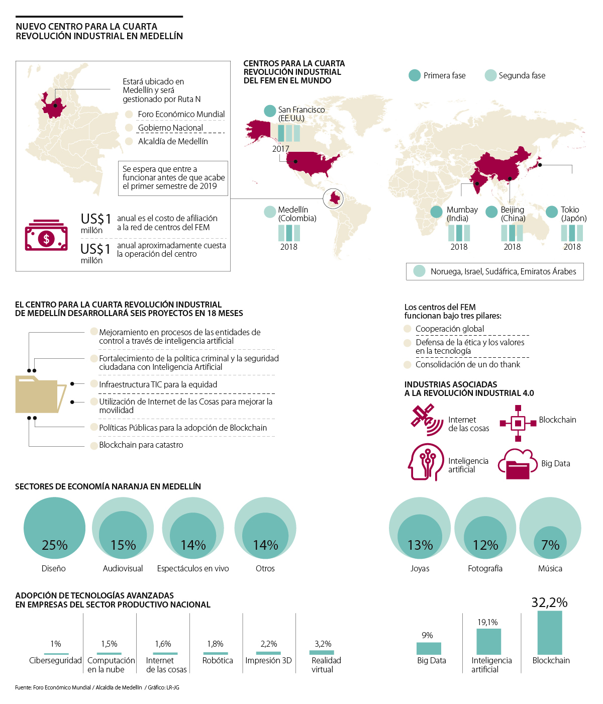 Aunque faltan un par de meses para que el Centro para la Cuarta Revolución Industrial de Medellín arranque a operar, desde ya el Gobierno, el FEM, la Alcaldía y Ruta N tienen previsto seis proyectos para que la entidad desarrolle en su primer año y medio de existencia.