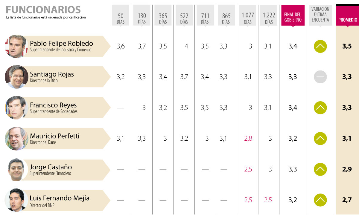 En el primer lugar de la última encuesta del Gobierno Santos, empataron con una calificación de 3,4 puntos Robledo y Reyes, y solo un punto por debajo quedó el director de la Dian y el Superfinanciero. Aunque no fue el que obtuvo la mejor calificación, el director del DNP, Luis Fernando Mejía, fue el que tuvo el crecimiento más importante, ya que mejoró en cinco décimas la nota de 2,7 en la edición pasada.