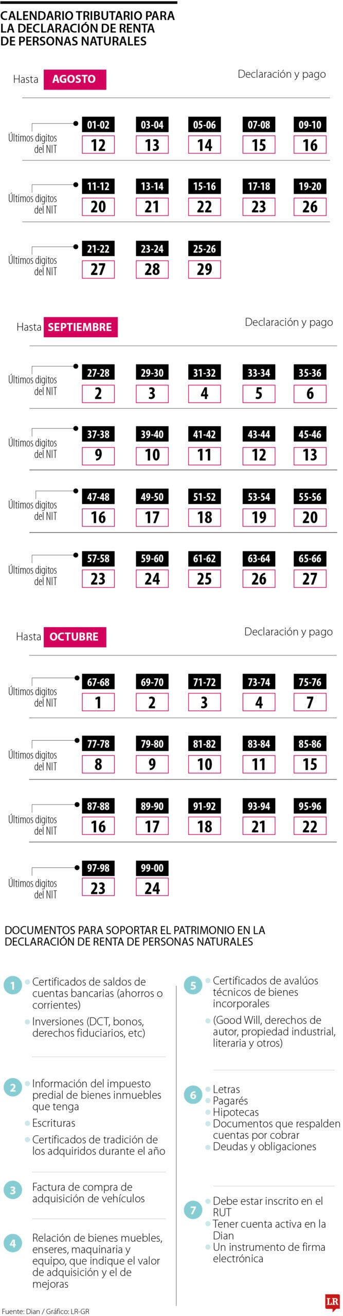 Desde el próximo lunes 12 de agosto comienza la temporada de declaración de renta para personas naturales, que se extenderá hasta octubre. Para saber en qué fecha debe presentar la declaración, este el el cronograma completo:
