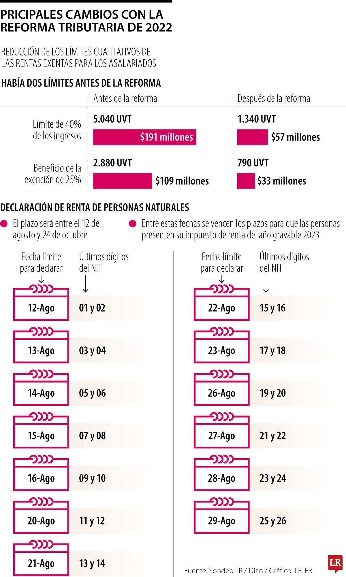 El primero era de 40% de los ingresos o 5.040 Unidades de Valor Tributario, UVT, que representa aproximadamente $191 millones. Con la reforma, este límite descendió a 1.340 UVT: $57 millones. El segundo beneficio fue el de la exención de 25%, que antes podía llegar hasta 2.880 UVT, lo que refleja un aproximado de $109 millones; lo anterior bajó con la reforma a 790 UVT ($33 millones).