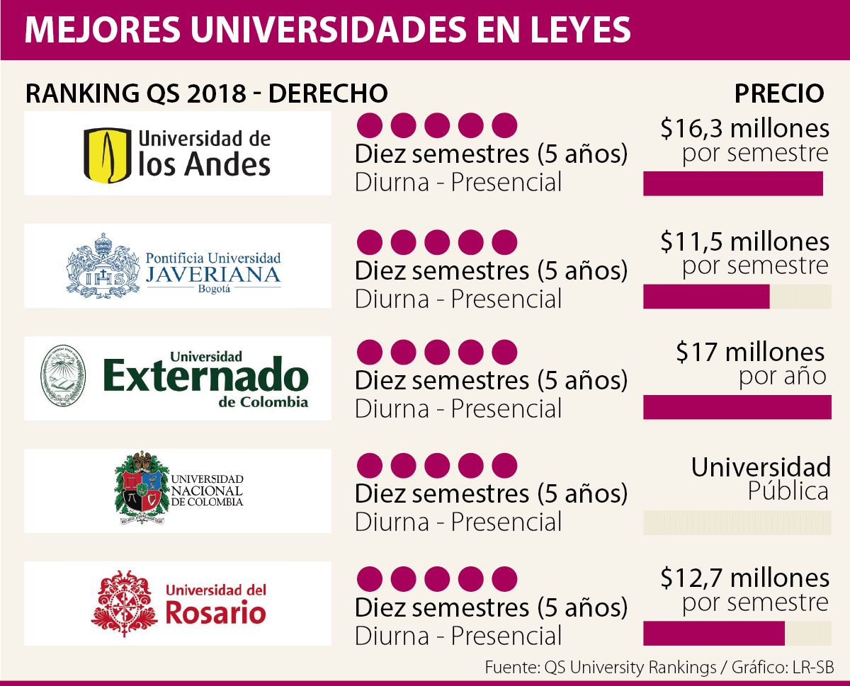 Ahora bien, la calidad de estas instituciones cuesta. El precio para estudiar derecho en la Universidad de los Andes es de $16,3 millones por semestre, lo que la hace la más cara dentro del ranking. En la Javeriana son $11, 5 millones por semestre. El Rosario cobra $12,7 millones semestre y en el Externado $17 millones por año.