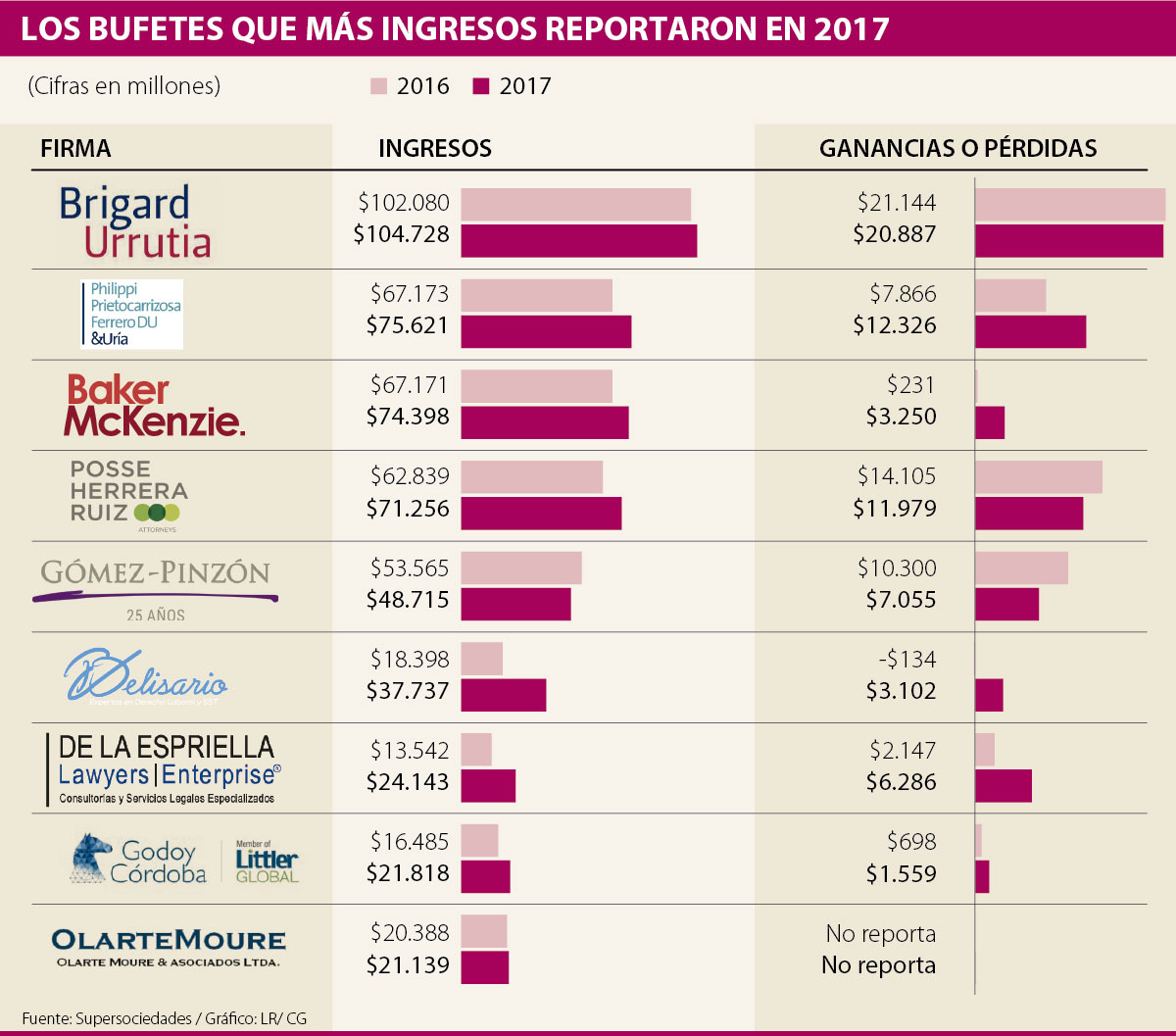 El año pasado, las firmas mostraron ganancias y de acuerdo con los reportes de la Superintendencia de Sociedades, el bufete con mayor facturación fue Brigard Urrutia que reportó ingresos por $104.728 millones y ganancias de $20.887 millones. Este despacho, en 2016, obtuvo ingresos por $102.080 millones.