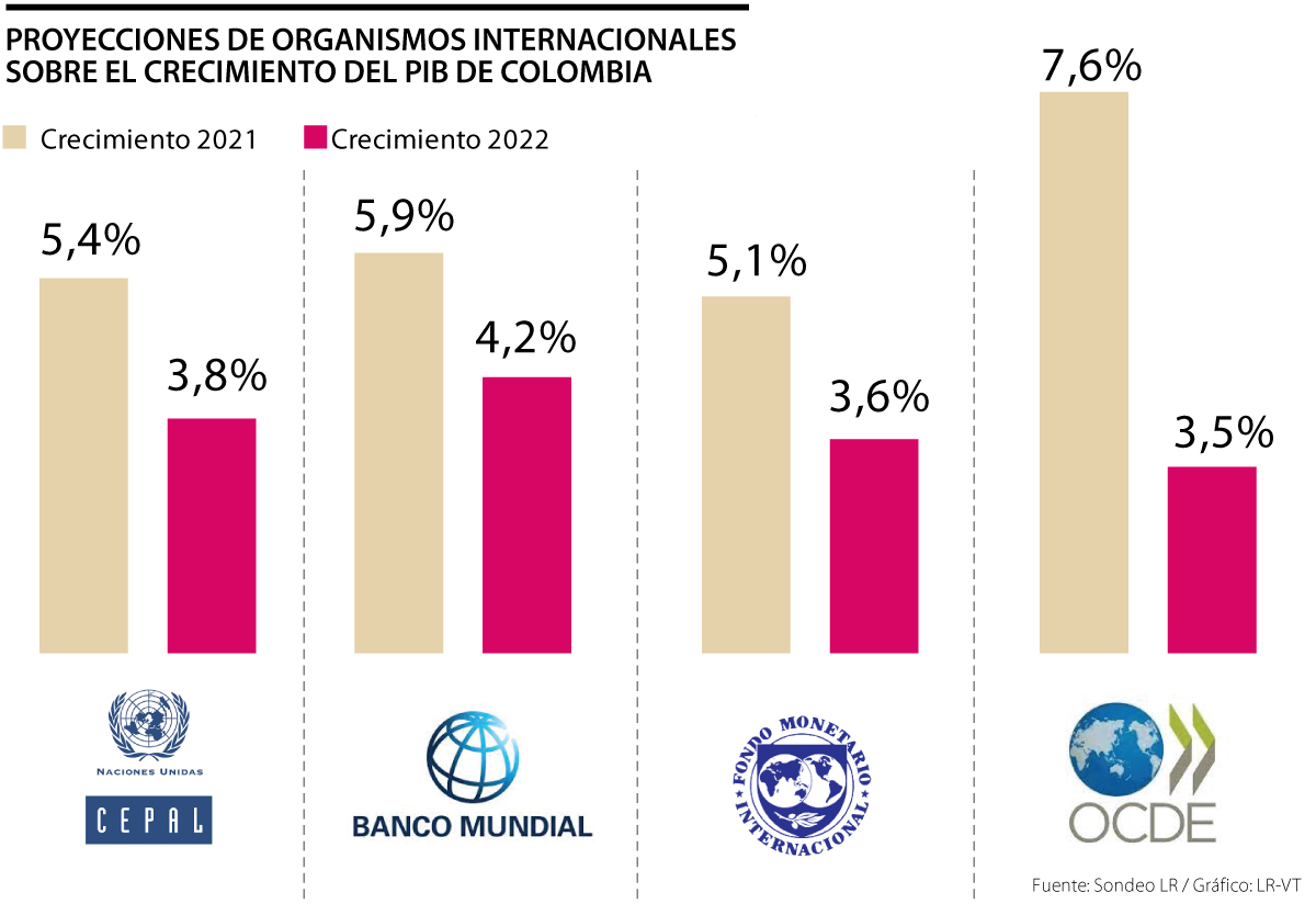 Entidades como el Banco Mundial, la Comisión Económica para América Latina y el Caribe (Cepal), el Fondo Monetario Internacional (FMI) y la Organización para la Cooperación y el Desarrollo Económicos (Ocde), pronosticaron para Colombia un crecimiento económico que oscilaría entre 5,1% y 7,6% para cierre del año 2021, y otro que gira entre 3,5% y 4,2% para 2022.