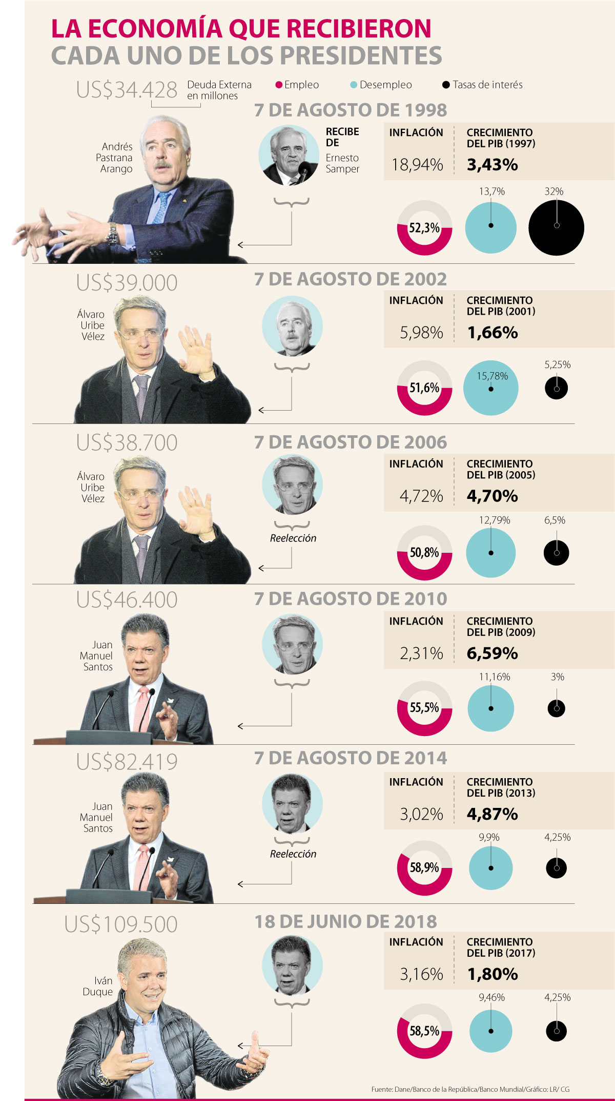Luego el 7 se agosto de 1998 recibió un país con una economía que se movió por cuenta de los cuatro años de Gobierno pasados, algo que se ha repetido por variables como la inflación, crecimiento del PIB, aumento de la deuda externa, tasas de interés y desempleo.