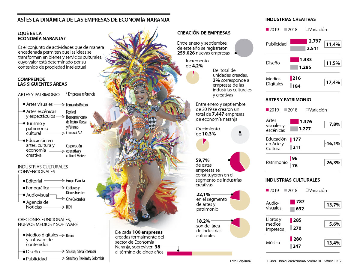 Es el caso de empresas audiovisuales como Cine Colombia o Royal Films, editoriales como Grupo Planeta, Librería Nacional o compañías fonográficas como Codiscos y Discos Fuentes, las únicas disqueras de origen nacional que sobreviven en Colombia y que llevan en el mercado más tiempo que el concepto de economía naranja.