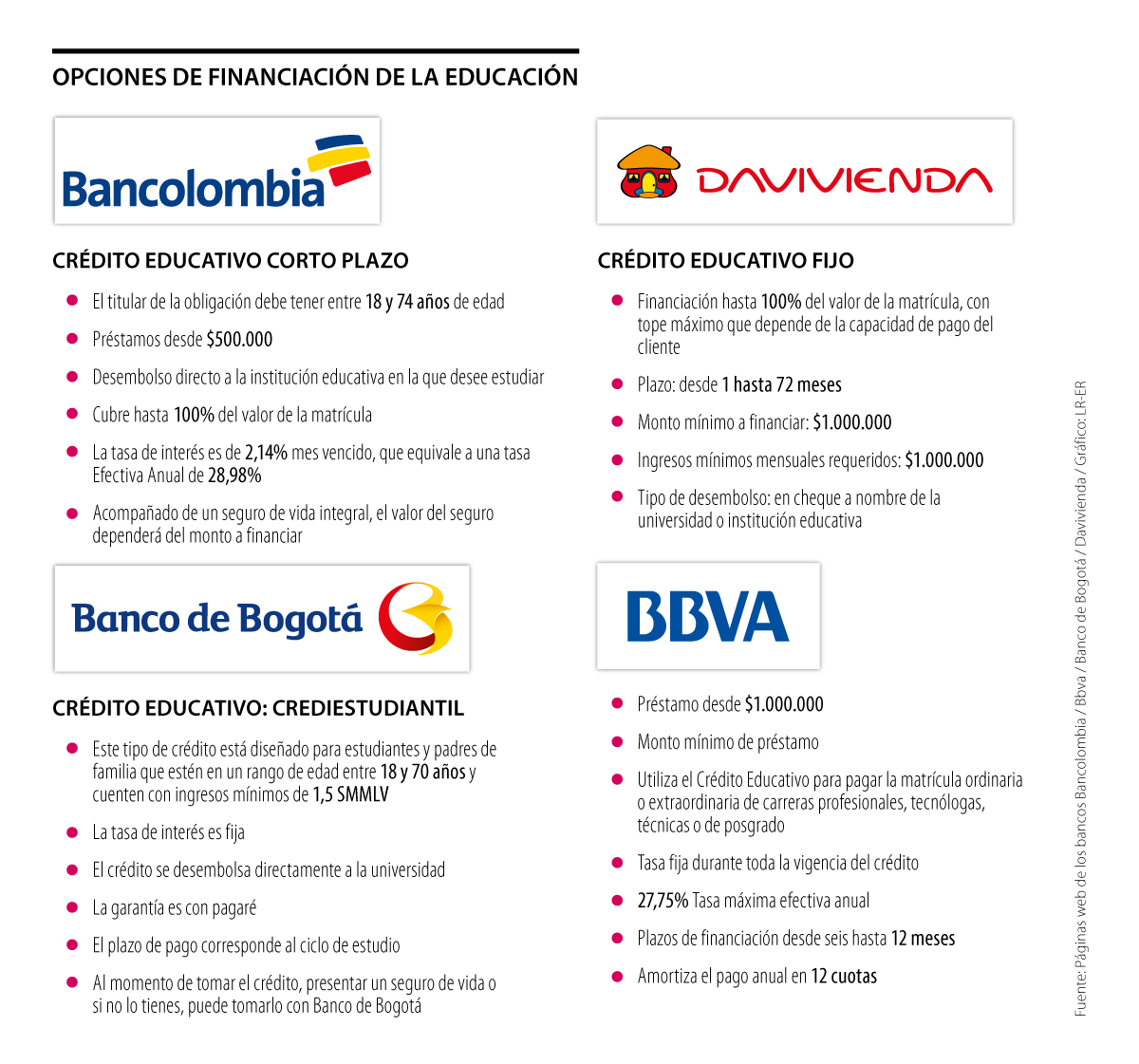 La banca privada también oferta muchas opciones de préstamos educativos. Entidades como Bancolombia, Bbva, AV Villas, Banco de Bogotá, Davivienda y Pichincha prestan desde un porcentaje parcial hasta todo el costo de la carrera a plazos que van desde seis meses hasta 10 o más años. Los créditos educativos suelen ser mucho más baratos que los de consumo. Las tasas anuales rondan entre 13% y 30% dependiendo de la entidad, de la carrera y del nivel socioeconómico del aspirante. Las entidades ofrecen diversas facilidades y beneficios bancarios.