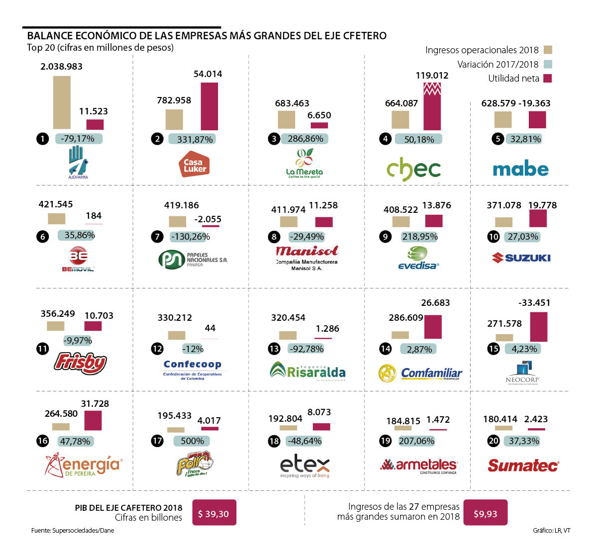 El top 10 de las empresas más grandes del Eje Cafetero (Risaralda, Quindío y Caldas), es encabezado por Audifarma, Casa Luker, Compañía Cafetera La Meseta S.A., Chec ESP, Mabe Colombia S.A.S., Bemovil S.A.S., Papeles Nacionales S.A., Compañía Manufacturera Manisol, EVE Distribuciones S.A.S., y Suzuki Motor de Colombia S.A. Las ventas de estas compañías durante el año pasado sumaron $6,8 billones según el informe de la Superintendencia de Sociedades.