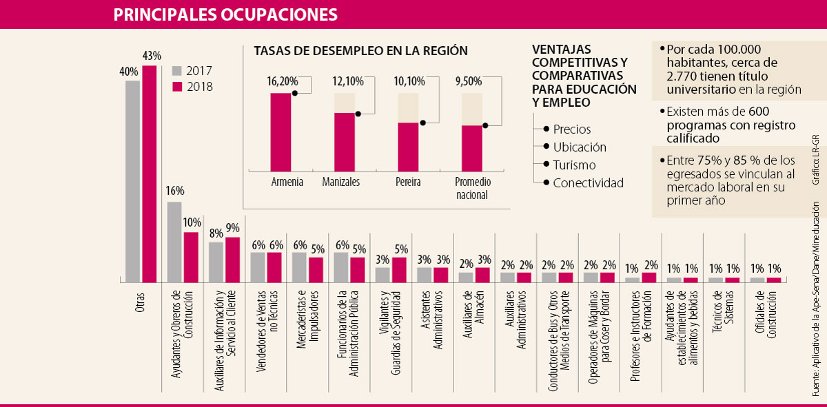 De acuerdo con Juan Carlos Montoya, economista de la Universidad del Quindío, “estas ocupaciones han escalado pues se desarrollan actualmente muchos proyectos de infraestructura en la región, incluidos sus municipios, que requieren mano de obra calificada, a la vez que la llegada de empresas relacionadas con servicios de contact center ha crecido en los últimos cinco años”.