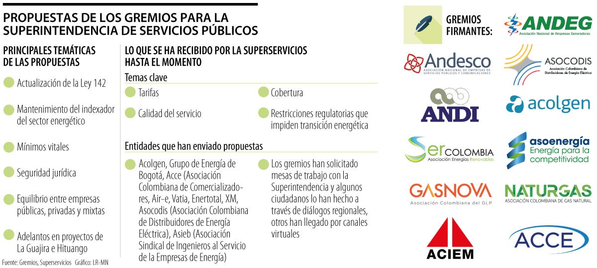 Se espera que esta semana se presente un pliego de propuestas que abordan esta temática. Según declaró a este diario Alejandro Castañeda, presidente de Andeg, las propuestas se están trabajando entre los gremios firmantes de los 10 principios expuestos para evitar retraso de inversiones en energía la semana pasada. Se trata de Andeg, Andesco, Asocodis, Acolgen, Andi, Asonoergía, Ser-Colombia, Naturgas, Aciem, Gasnova y Acce.