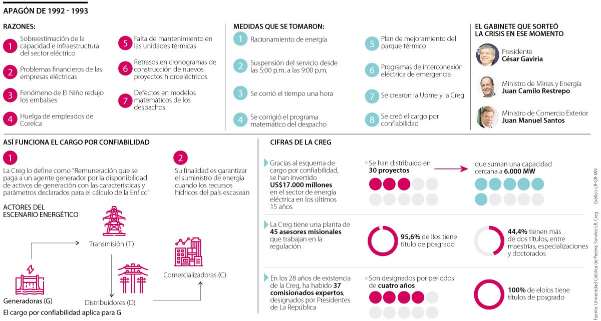 Un par de años después, en 1994, se crearon instituciones: la Unidad de Planeación Minero Energética (Upme) y la Comisión de Regulación de Energía y Gas (Creg). Luego, en 2006, esta última institución también creó el cargo por confiabilidad, con el objetivo de garantizar la confiabilidad en el suministro de energía eléctrica para el país.