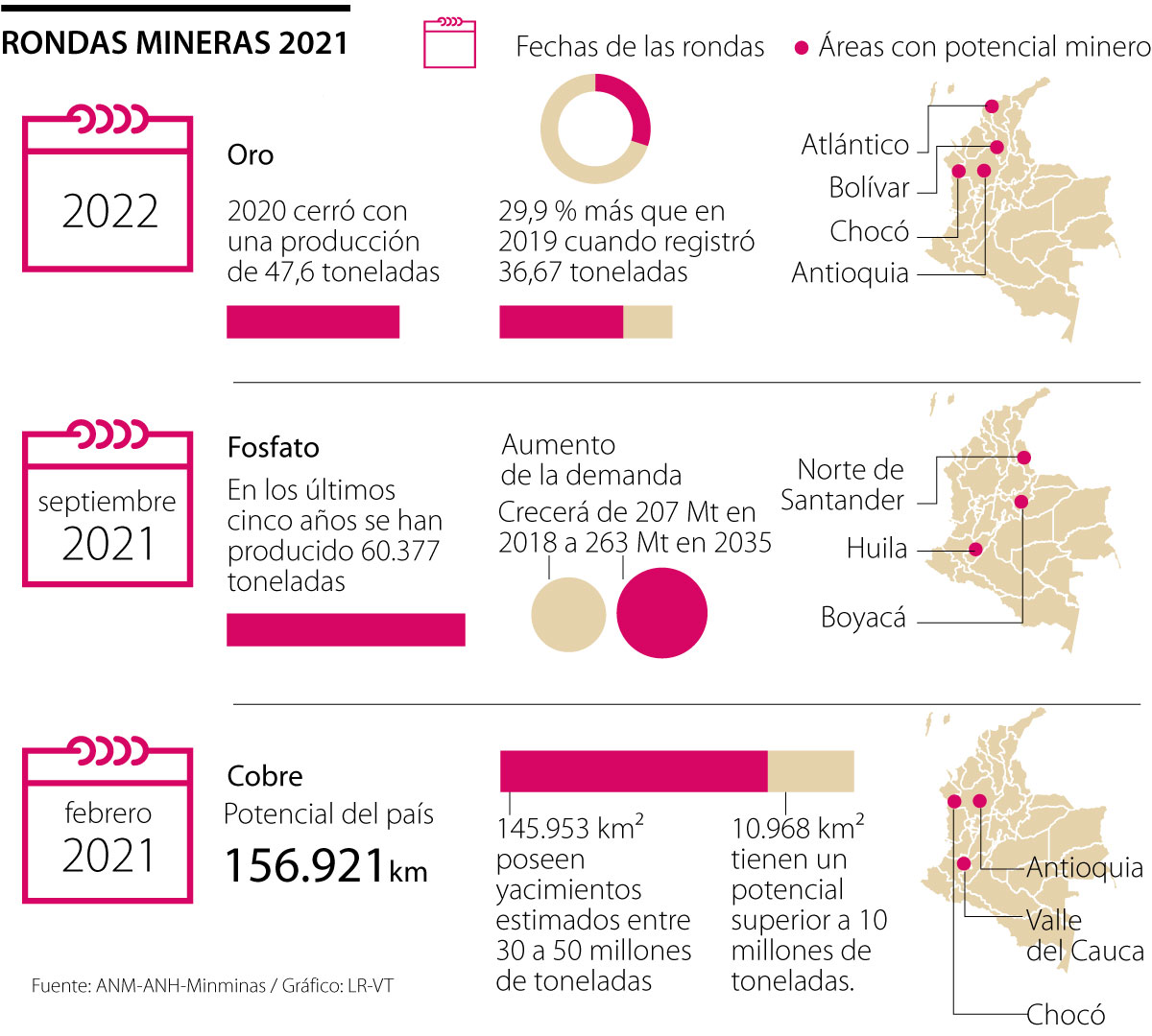 Otro de los minerales que irán a ronda minera este año es el fosfato. Esta adjudicación se hará en septiembre y las zonas con mayor producción de este recurso están en Boyacá, Huila y Norte de Santander, con una producción promedio para los últimos cinco años de 60.377 toneladas. El oro, por su parte lo hará en 2022.
