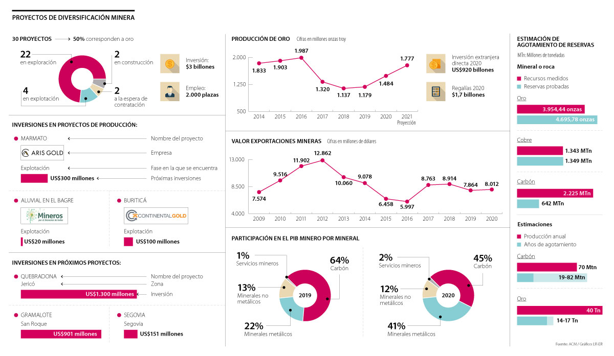 Pese a registrar una caída histórica en su aporte al PIB durante 2020, por factores como la reducción de 49% en la inversión extranjera directa y una cifra de exportaciones de oro no evidenciada desde 2017, la minería es uno de los sectores que promete contribuir con más fuerza a la reactivación económica.