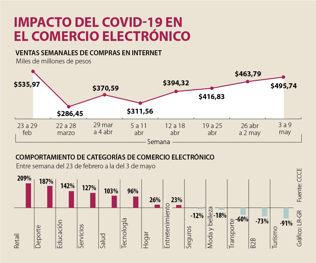 De acuerdo con un estudio de la Cámara Colombiana de Comercio Electrónico (Ccce), “durante la pandemia del covid-19 los colombianos han recurrido masivamente al comercio electrónico para satisfacer sus necesidades” y prueba de esto es que si bien las ventas a través de este canal “se vieron fuertemente afectadas en la primera semana del distanciamiento social obligatorio, cayendo 46% respecto a la última semana de febrero (última semana de normalidad), en abril y mayo se ha presentado un crecimiento sostenido del sector, de 12% en promedio cada semana” (ver gráfico).