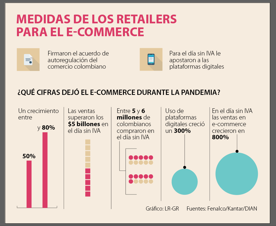 Según una publicación de la Cámara Colombiana de Comercio Electrónico, el e-commerce creció entre 50% y 80% durante los primeros meses de la cuarentena, siendo las categorías de deportes (85,6%), retail (52,9%) y salud (38,2%) las que más crecieron.