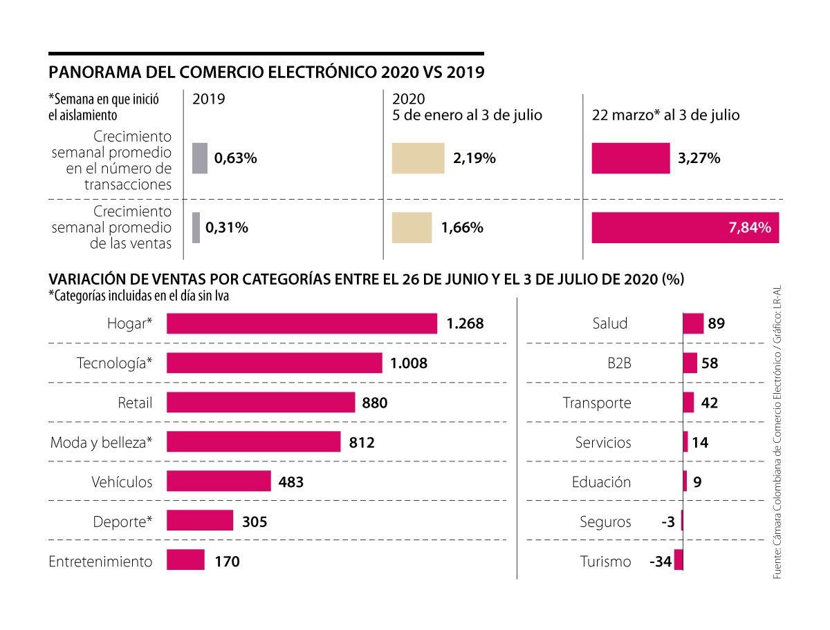 Precisamente, según la Cámara Colombiana del Comercio Electrónico (Ccce), desde el inicio de la cuarentena hasta el 3 de julio, el comercio electrónico ha tenido un crecimiento semanal de 7,84%.