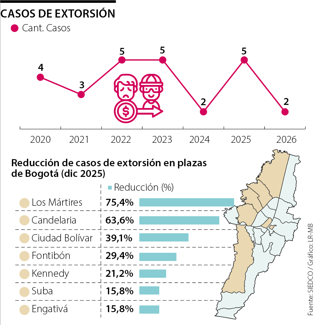 En ciudades capitales, como Bogotá o Medellín, la problemática ya se ha identificado y se han lanzado estrategias para reducir la amenaza de estas redes que desembocan en delitos como la extorsión. En Bogotá, el Gaula y el Instituto para la Economía Social, Ipes reducieron en 23% los casos de este delito en estos espacios en 2025. Se trató de una estrategia integral en 18 plazas distritales con conferencias pedagógicas e intervenciones en territorio.